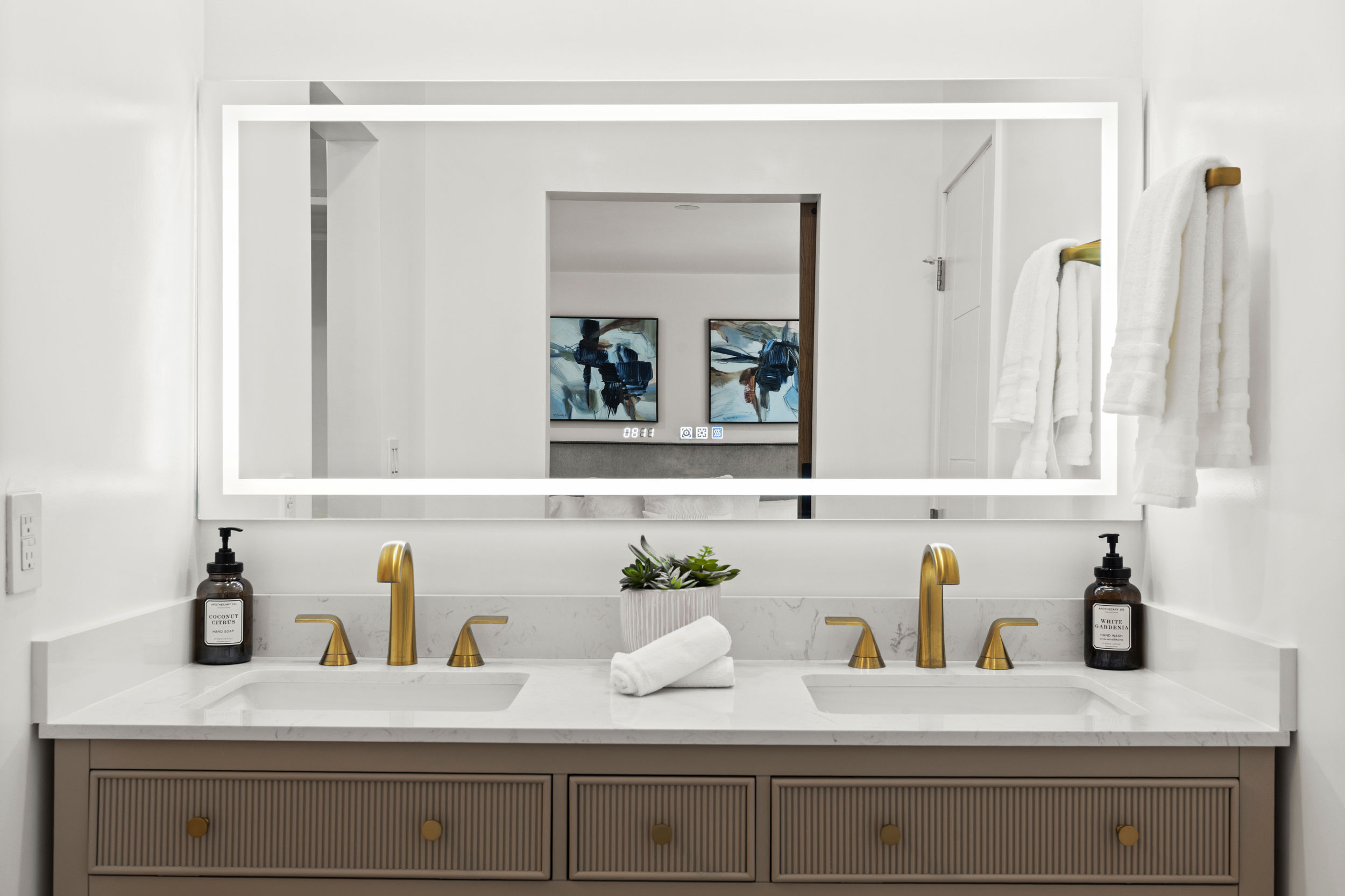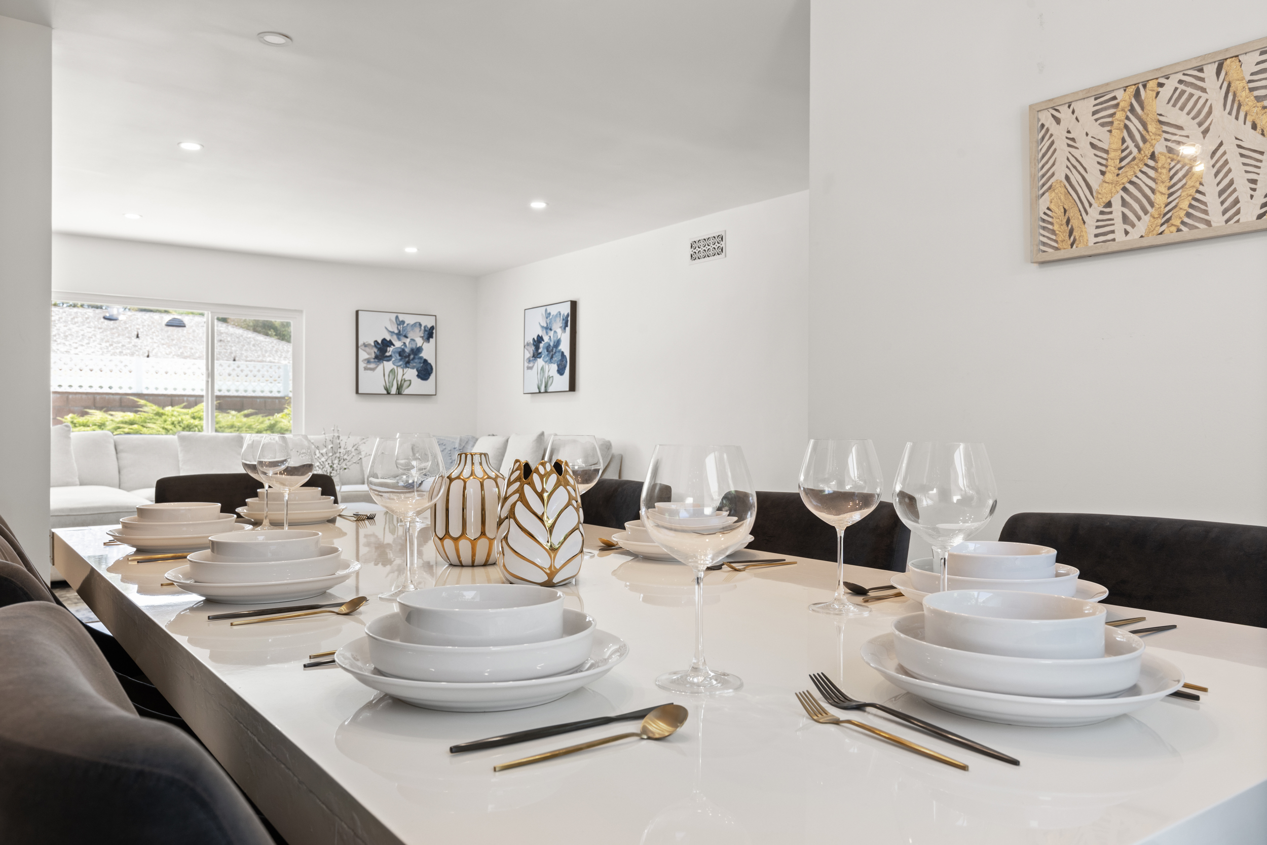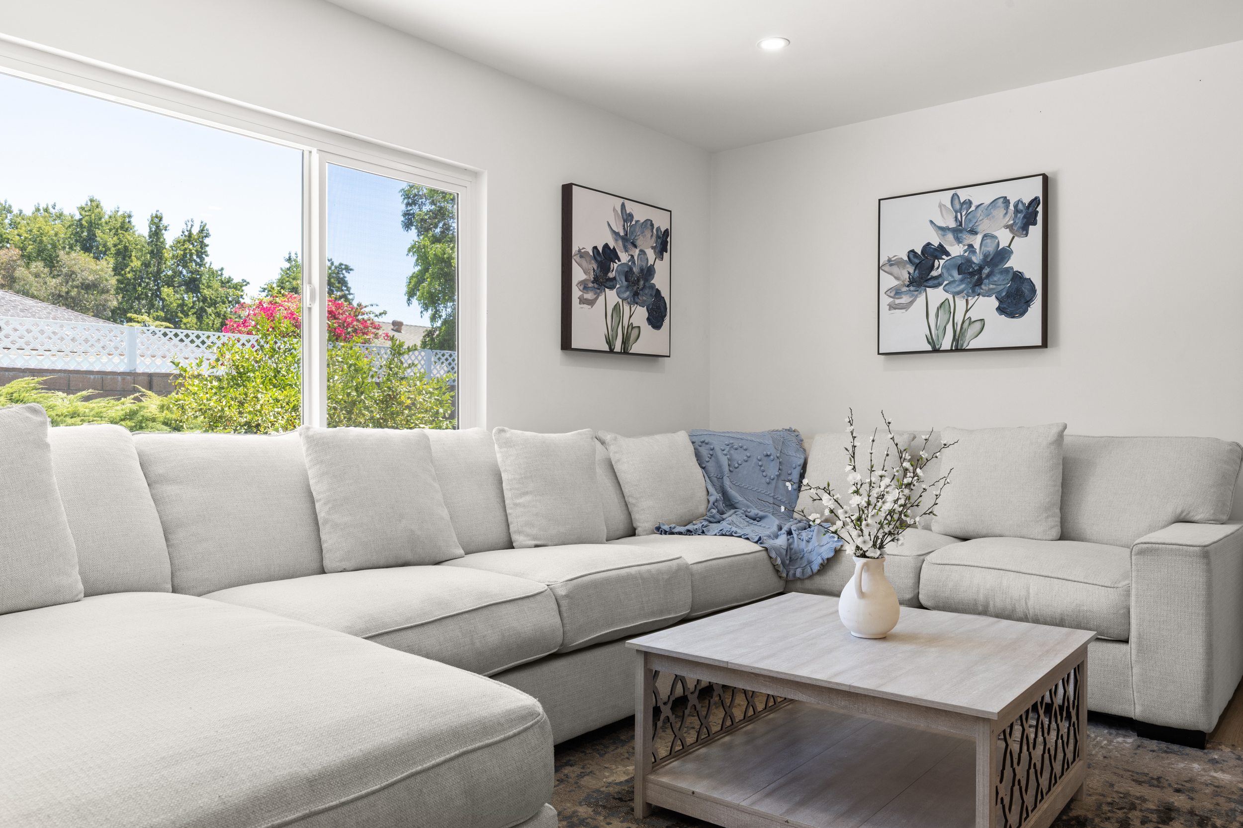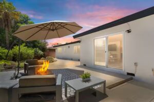 Outside, the expansive backyard is your private retreat—perfect for relaxation, or soaking in the Southern California sun. At the heart of the space is a custom fire pit, ideal for roasting s’mores, evening conversations, or cozy nights under the stars.
